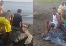 Στο οπτικό υλικό που είδε το φως της δημοσιότητας φαίνονται δεκάδες ντόπιοι να καβαλούν την χελώνα πάνω στο καβούκι της και να την εμποδίζουν...