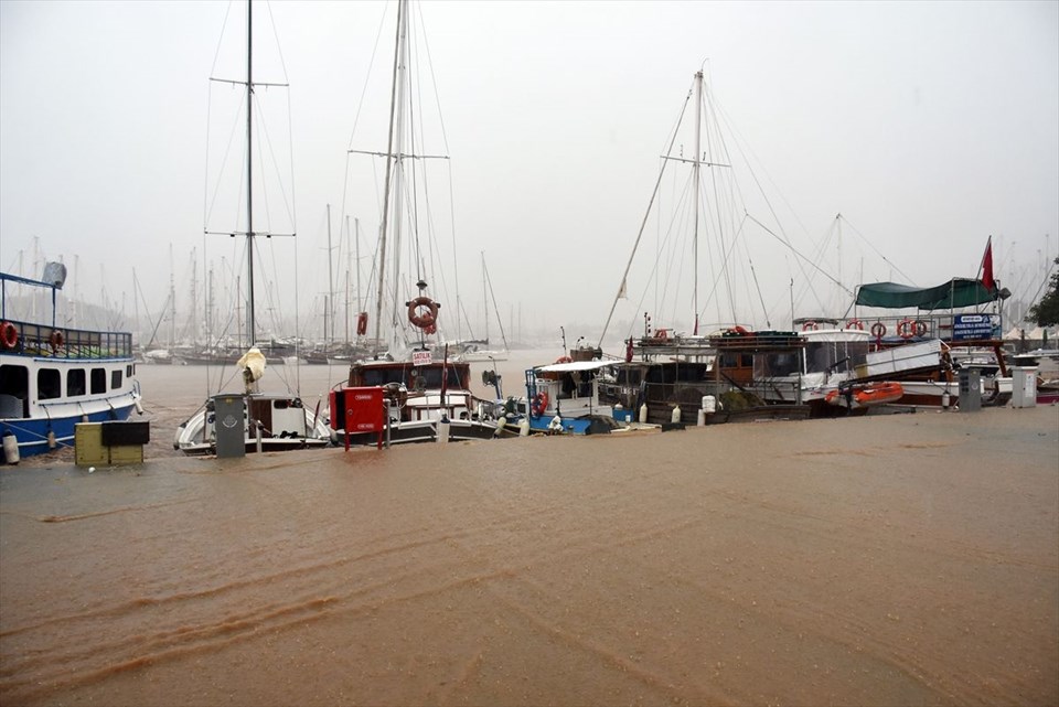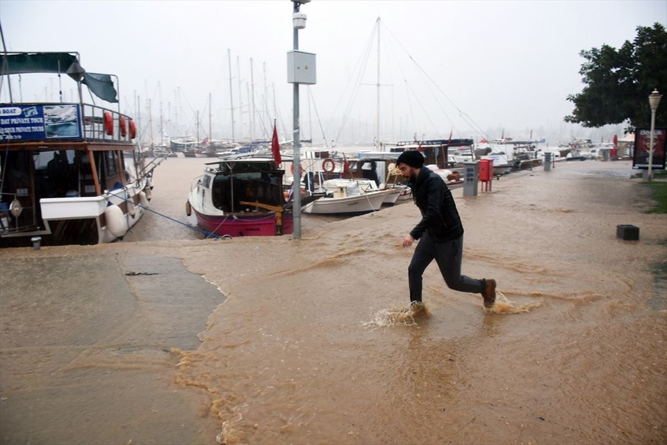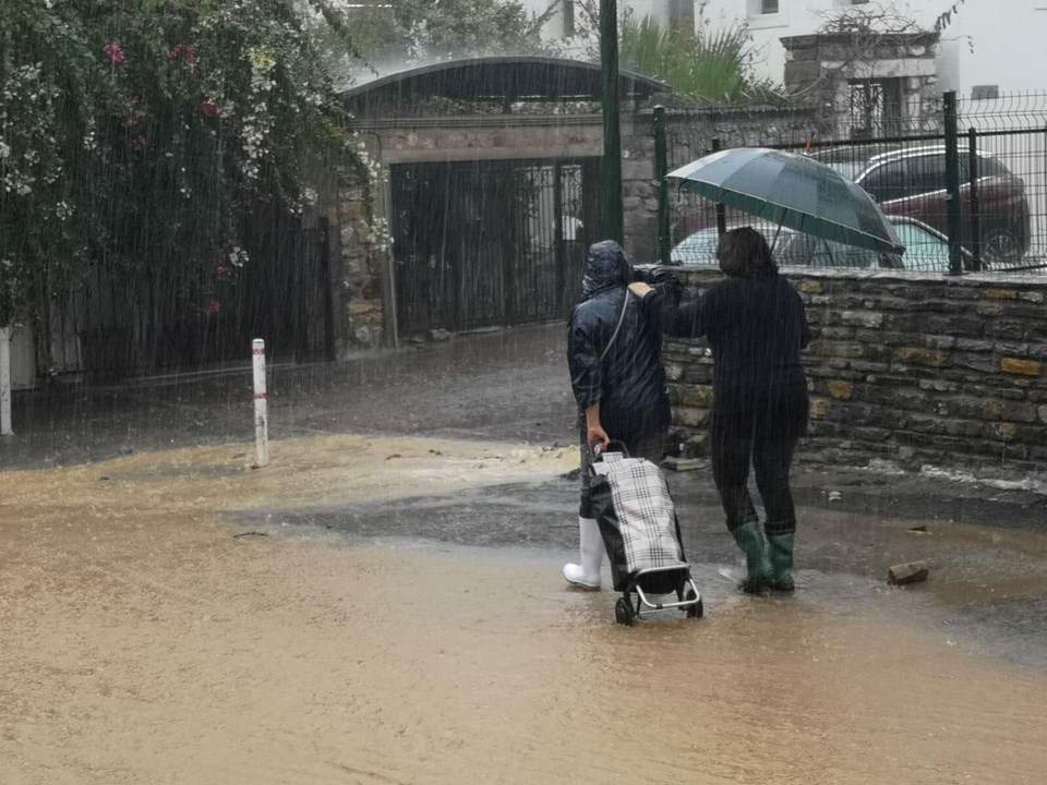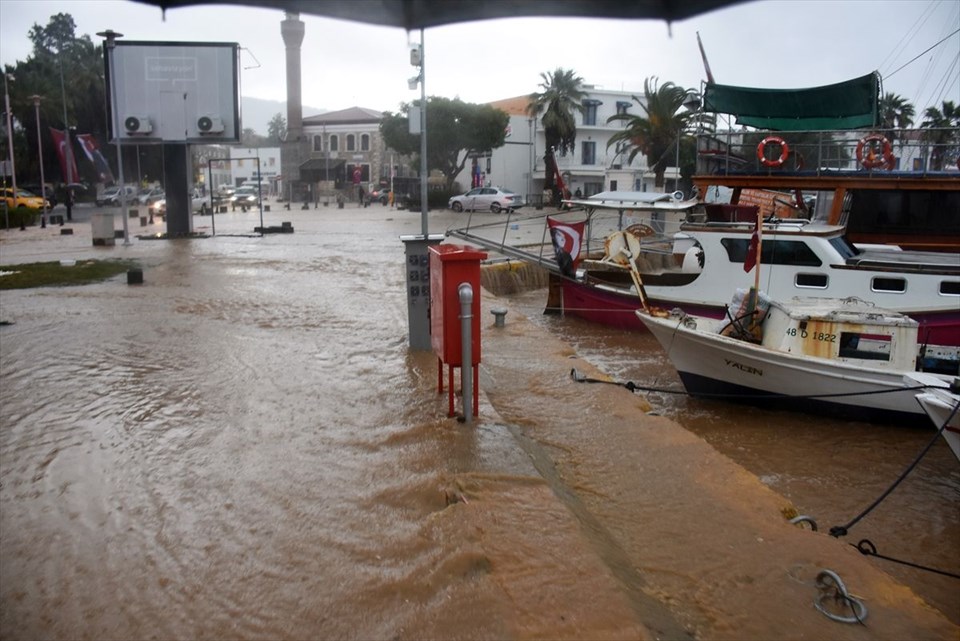 Bodrum’da denizde oluşan hortumun ardından başlayan şiddetli yağmur, hayatı felç etti. Yağış nedeniyle cadde ve sokaklar göle döndü, ev ve işyerlerinde su baskınları yaşandı. Sağanak sonucu oluşan çamurlu suyun denize döküldüğü Kumbahçe sahilinde ve limanda, suyun rengi kahverengiye döndü.