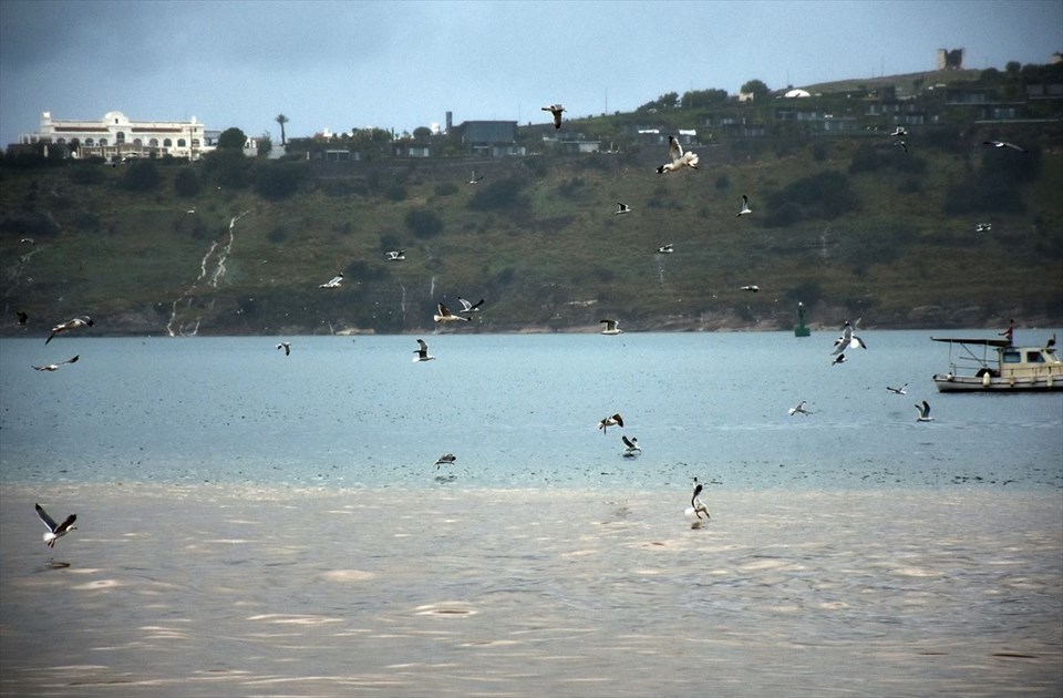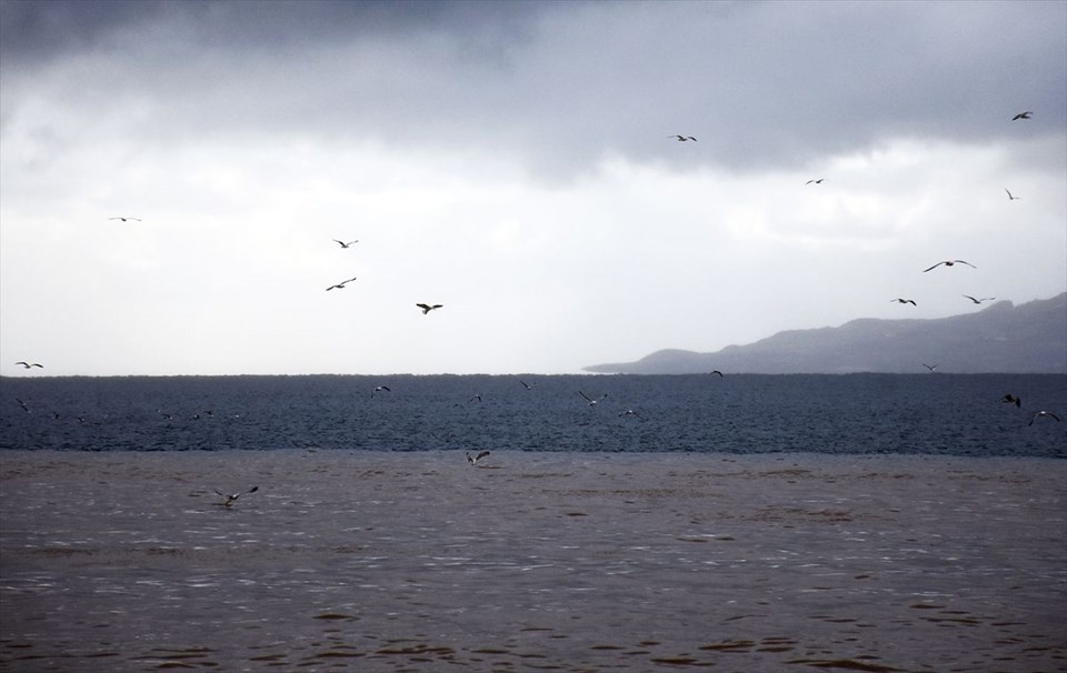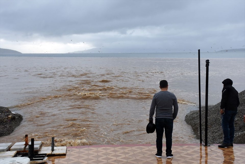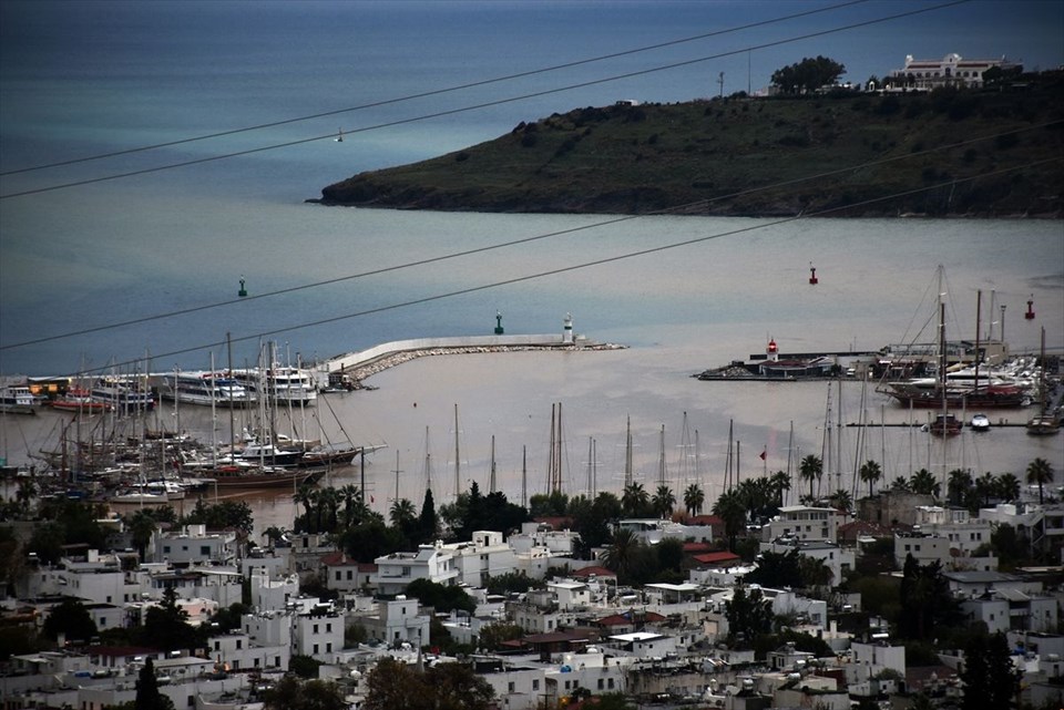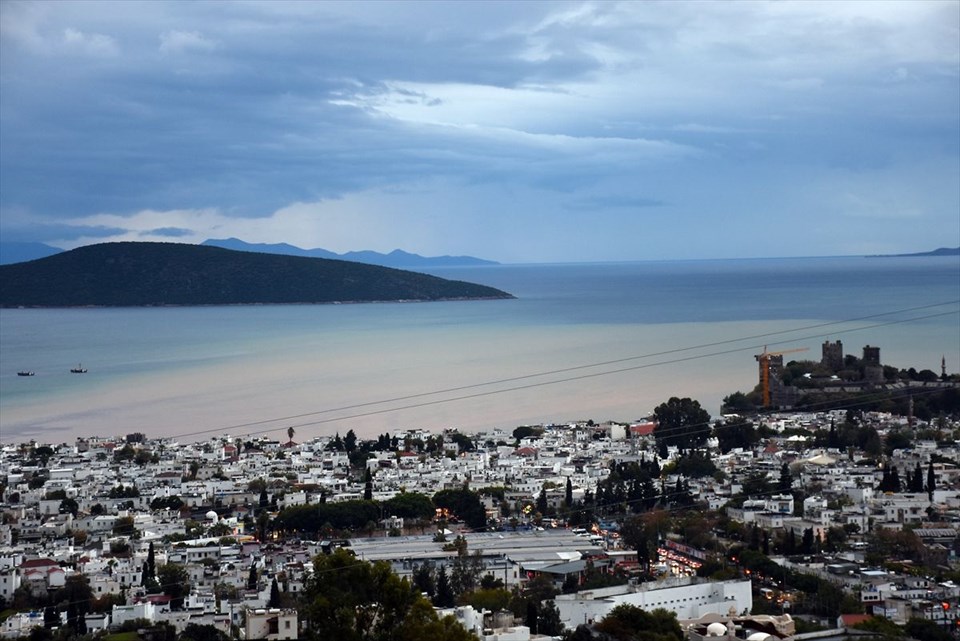Bodrum’da, sağanak sonucu oluşan çamurlu suyun denize döküldüğü Kumbahçe sahilinde ve limanda, suyun rengi kahverengiye döndü. -