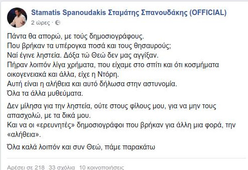 Με μια ανάρτηση που έκανε ο Σταμάτης Σπανουδάκης επιβεβαιώνει την ληστεία που έγινε σπίτι του, αλλά διαψεύδει τα ποσά που ακούστηκαν και επικρίνει τα ΜΜΕ που έκαναν λόγο για «υπέρογκα ποσά και θησαυρούς».