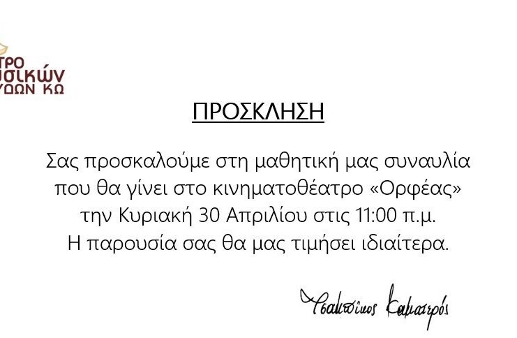Το Διοικητικό Συμβούλιο του Διεθνούς Ιπποκρατείου Ιδρύματος καλεί τα Μέλη του στην Γενική Ενημερωτική Συνέλευση που θα πραγματοποιηθεί στις εγκαταστάσεις του την Κυριακή, 29...