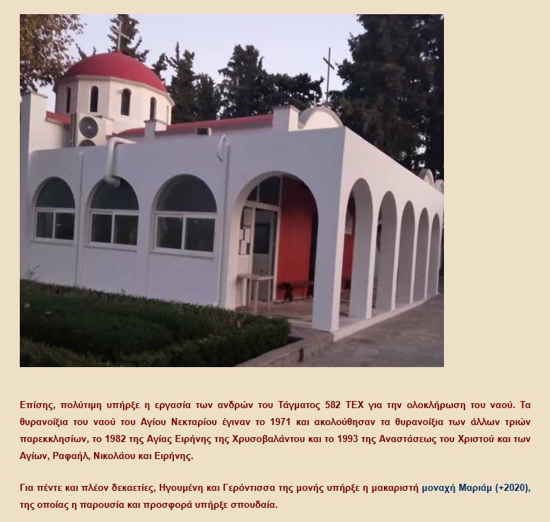 Το 1982 κτίσθηκε το δεύτερο Ιερό Παρεκκλήσιο επ’ ονόματι της Αγίας Ειρήνης Χρυσοβαλάντου και το 1993 το τρίτο της Αναστάσεως του Χριστού  και των νεοφανών Αγίων, Ραφαήλ, Νικολάου και Ειρήνης.