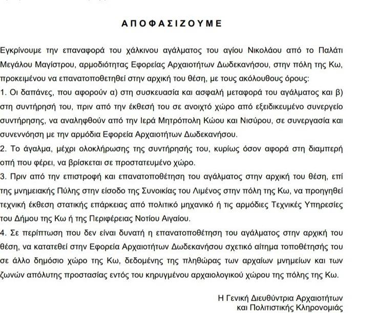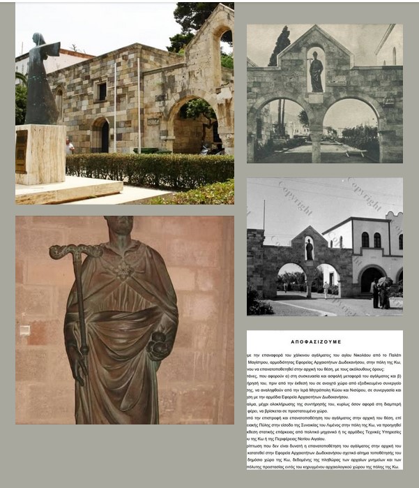 Το χάλκινο άγαλμα του Αγίου Νικολάου που βρισκόταν στην Κω και μετά την Ενσωμάτωση μεταφέρθηκε στο Παρεκκλήσιο του Παλατιού του Μεγάλου Μαγίστρου στη Ρόδο, επιστρέφει μετά από πολλές δεκαετίες ξανά στη θέση του, στην πόλη μας!