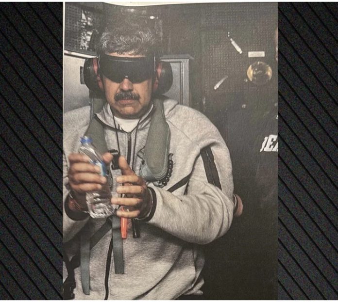 Συγκεκριμένα, το WRadio δημοσίευσε μια φωτογραφία του προέδρου της Βενεζουέλας από το εσωτερικό στρατιωτικού ιπτάμενου μέσου με χειροπέδες.