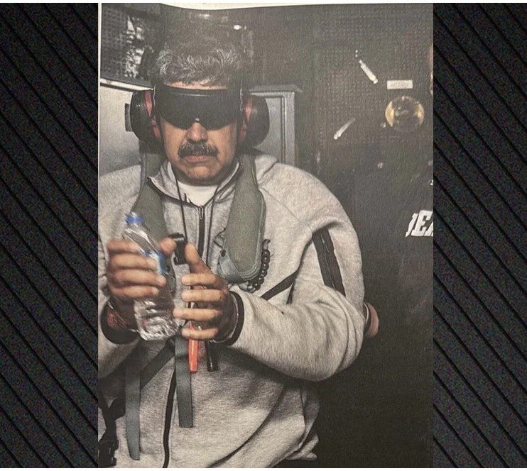 Ο Μαδούρο είναι επάνω στο αμερικανικό αεροπλανοφόρο Iwo Jima, φοράει γκρι φόρμα και έχει τόσο τα μάτια όσο και τα αυτιά του καλυμμένα. Τα χέρια του είναι δεμένα και με δυσκολία κρατάει ένα μπουκάλι νερό.