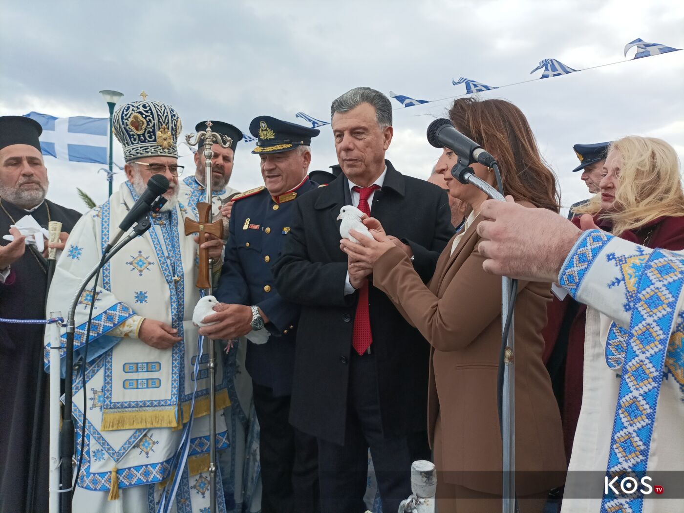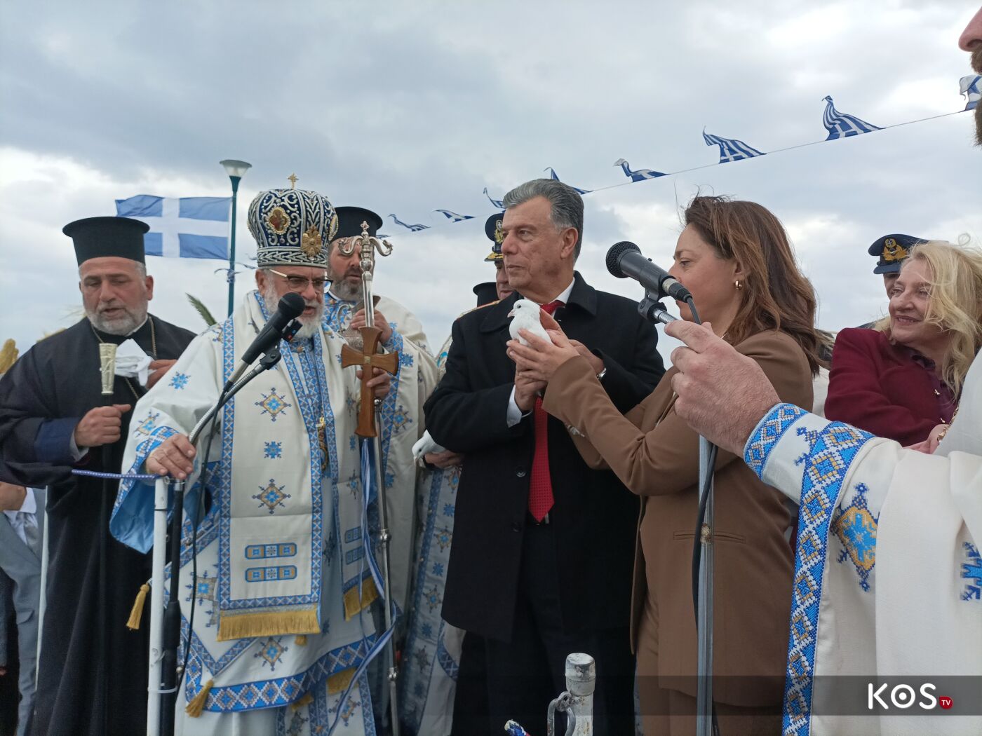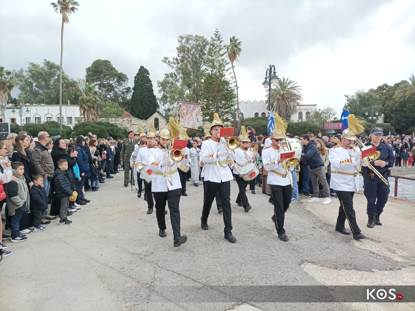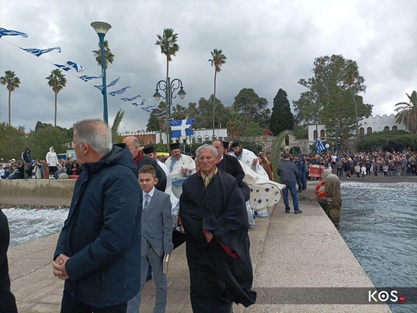Με το πέρας της Θείας Λειτουργίας από τον Ιερό Ναό του Αγίου Νικολάου ξεκίνησε η πομπή με τις δέουσες τιμές, και με την συνοδεία της Φιλαρμονικής του Δήμου Κω η οποία προπορευόταν και άγημα του στρατού, ως τον πολεμικό προβλήτα, όπου και έγινε η κατάδυση του Τιμίου Σταυρού και ο Αγιασμός των Υδάτων.
