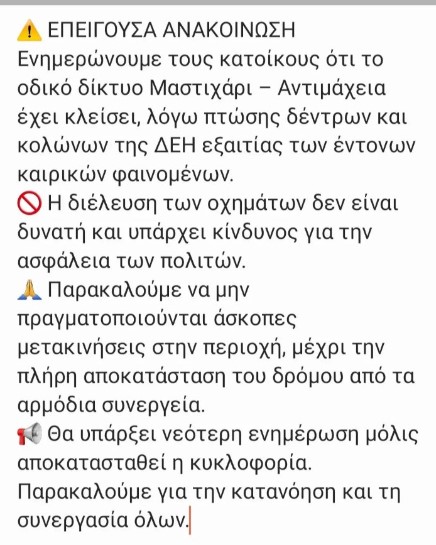 Διεκόπη η κυκλοφορία στο δρόμο Αντιμάχεια-Μαστιχάρι λόγω πτώσης δέντρων γύρω στις 6 και μισή απόψε, καθώς και η ρευματοδότηση της περιοχής, λόγω ζημιών στο δίκτυο.