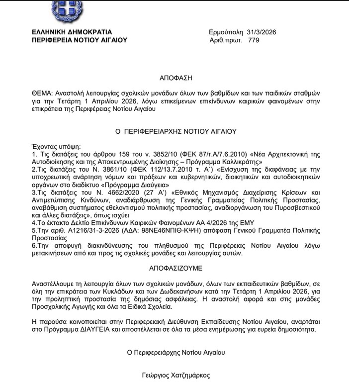 Με απόφαση του Περιφερειάρχη Νοτίου Αιγαίου Γιώργου Χατζημάρκου, αναστέλλεται η λειτουργία όλων των σχολικών μονάδων όλων των βαθμίδων, καθώς και των παιδικών σταθμών, σε όλα τα νησιά της Περιφέρειας Νοτίου Αιγαίου, για την Τετάρτη 1 Απριλίου 2026.