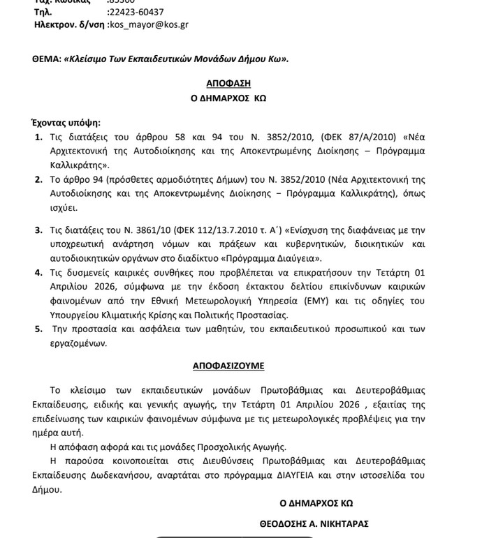 Ο Δήμαρχος Κω έλαβε τη σχετική απόφαση, για την προστασία και ασφάλεια των μαθητών, του εκπαιδευτικού προσωπικού και των εργαζομένων, λαμβάνοντας υπόψη τις δυσμενείς καιρικές συνθήκες που προβλέπεται να επικρατήσουν αύριο Τετάρτη 1η Απριλίου 2026, σύμφωνα με την έκδοση έκτακτου δελτίου επικίνδυνων καιρικών φαινομένων από την Εθνική Μετεωρολογική Υπηρεσία (ΕΜΥ) και τις οδηγίες του Υπουργείου Κλιματικής Κρίσης και Πολιτικής Προστασίας.