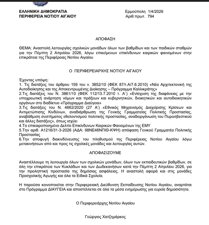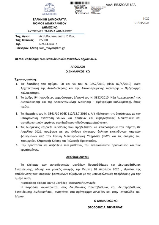 Ο Δήμαρχος Κω έλαβε τη σχετική απόφαση, για την προστασία και ασφάλεια των μαθητών, του εκπαιδευτικού προσωπικού και των εργαζομένων, λαμβάνοντας υπόψη τις δυσμενείς καιρικές συνθήκες που προβλέπεται να επικρατήσουν και αύριο, Πέμπτη 2 Απριλίου 2026, σύμφωνα με την έκδοση έκτακτου δελτίου επικίνδυνων καιρικών φαινομένων από την Εθνική Μετεωρολογική Υπηρεσία (ΕΜΥ) και τις οδηγίες του Υπουργείου Κλιματικής Κρίσης και Πολιτικής Προστασίας.