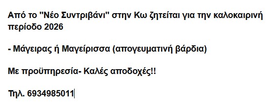 Μικρές Αγγελίες Από το «Νέο Συντριβάνι» στην Κω ζητείται Μάγειρας ή Μαγείρισσα (απογευματινή βάρδια) – Καλές αποδοχές! Από aegeanews - 28 Μαρ 2026 0 178 Κοινοποίηση στο Facebook Μοιραστείτε στο X