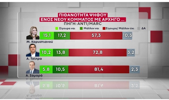 Τη μεγαλύτερη δυνητική δυναμική εμφανίζει ένα κόμμα υπό την Μαρία Καρυστιανού, η πιθανότητα ψήφου φτάνει στο 32,3% – Στο 24% το «κόμμα Τσίπρα», στο 16,3% το «κόμμα Σαμαρά» – Σε πολύ χαμηλότερα επίπεδα εκείνοι που δηλώνουν βεβαιότητα για την ψήφο τους – Με διακομματικά χαρακτηριστικά η αποδοχή Μητσοτάκη για την πρωθυπουργία – Δείτε την παρουσίαση της έρευνας