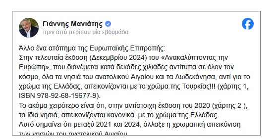 Συγχαίρουμε τον ευρωβουλευτή κ. Γιάννη Μανιάτη για την καταγγελία του στην Ευρωπαϊκή Επιτροπή σχετικά με χάρτη της Κομισιόν, στον οποίον απεικονίζονται τα νησιά του ανατολικού Αιγαίου και τα ∆ωδεκάνησα με τουρκικά χρώματα. Με την αφορμή αυτή θα ήθελα να προσθέσω ότι, από διετίας τουλάχιστον, προβάλλεται έξω από το λιμενικό πρακτορείο του Bodrum (αρχ. Αλικαρνασσός) χάρτης του υπουργείου Τουρισμού της γείτονος χώρας, στον οποίον όλα ανεξαιρέτως τα ελληνικά νησιά του Αιγαίου, ακόμα και η εμβληματική για το ελληνικό έθνος Σαλαμίνα, έχουν το ίδιο ερυθρωπό χρώμα με την Τουρκία!