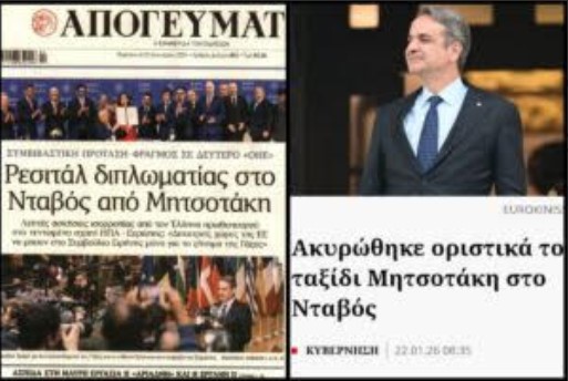Η εφημερίδα δημοσίευσε πρωτοσέλιδο με εγκωμιαστικό ύφος για την υποτιθέμενη διπλωματική παρουσία του πρωθυπουργού Κυριάκου Μητσοτάκη στο Νταβός, περιγράφοντας «ρεσιτάλ διπλωματίας». Το πρόβλημα;