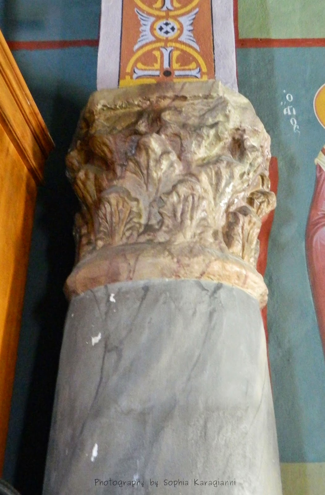 Το εσωτερικό του ναού έχει πολύ ενδιαφέροντα στοιχεία,όπως για παράδειγμα, αρχαίους κίονες με κορινθιακά κιονόκρανα.