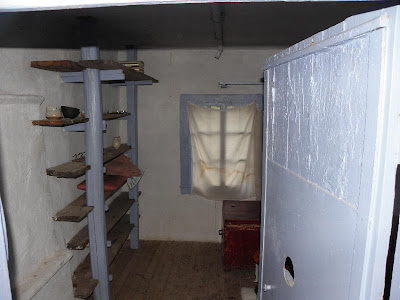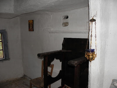 Εντυπωσιακή απλότητα. Λίγα μέτρα δυτικότερα από την είσοδο άλλη εξωτερική πόρτα οδηγούσε στο εργαστήριο του και στο Αρχονταρίκι. ένα μικρό, φτωχό κελλάκι με χαμηλό ταβάνι από καλάμια και χώμα, και με δυο πολύ στενά κρεβάτια, που μεταξύ τους απείχαν ελάχιστα, μόλις χωρούσε να σταθεί ένας άνθρωπος.