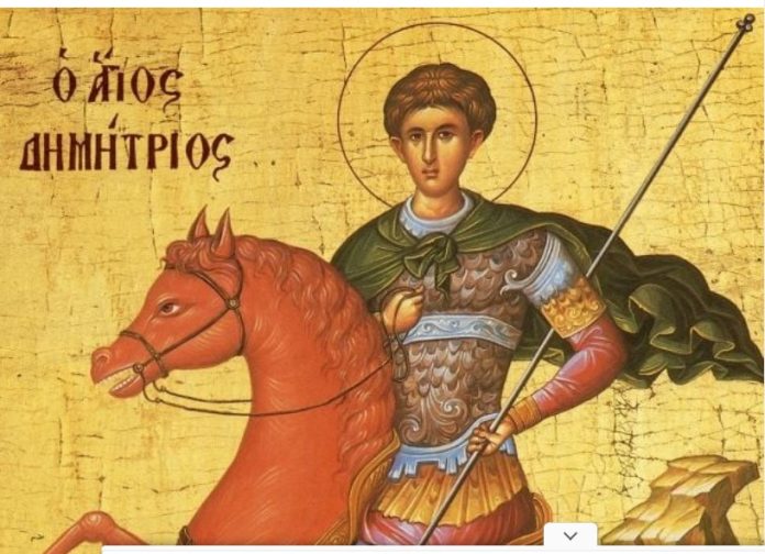 [13] Άγιος Δημήτριος: Μεγάλος Άγιος του Χριστιανικού κόσμου, γεννήθηκε το 280-284 μ. Χ. και μαρτύρησε επί των αυτοκρατόρων Διοκλητιανού και Μαξιμιανού το 306 μ. Χ. στη Θεσσαλονίκη. Τιμάται ως πολιούχος της Θεσσαλονίκης, όπου εκεί βρίσκονται ο τάφος και τα λείψανά του. Επίσης, είναι στρατιωτικός Άγιος και απεικονίζεται στην αγιογραφία ως καβαλάρης πάνω σε ένα κόκκινο άλογο να σκοτώνει με το δόρυ του, τον πολεμοχαρή τσάρο των Βουλγάρων, Ιωανίτζη, που οι Βυζαντινοί τον αποκαλούσαν Σκυλογιάννη.
