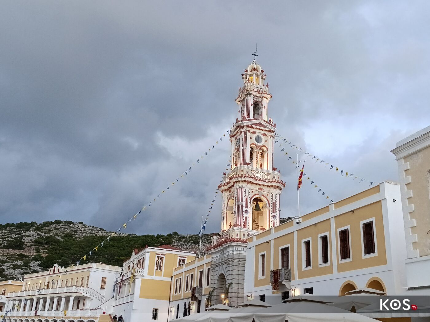Οι καμπάνες της Ιεράς Μονής Αρχαγγέλου Μιχαήλ του Πανορμίτη χτυπούσαν εκκωφαντικά κάνοντας την ατμόσφαιρα ακόμη πιο ιδιαίτερη.