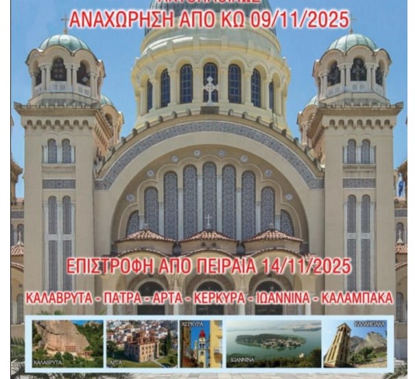 Πρόκειται για την προσκυνηματική εκδρομή της ενορίας Αγίου Νικολάου Πυλίου σε Καλάβρυτα, Πάτρα, Άρτα, Κέρκυρα, Ιωάννινα, Καλαμπάκα και της ενορίας Αγίου Παύλου Κω στην Κεντρική Μακεδονία: