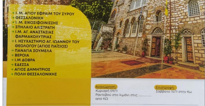 Πρόκειται για την προσκυνηματική εκδρομή της ενορίας Αγίου Νικολάου Πυλίου σε Καλάβρυτα, Πάτρα, Άρτα, Κέρκυρα, Ιωάννινα, Καλαμπάκα και της ενορίας Αγίου Παύλου Κω στην Κεντρική Μακεδονία: