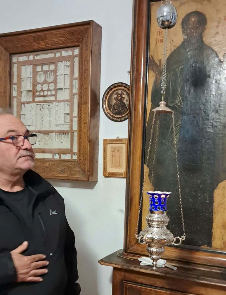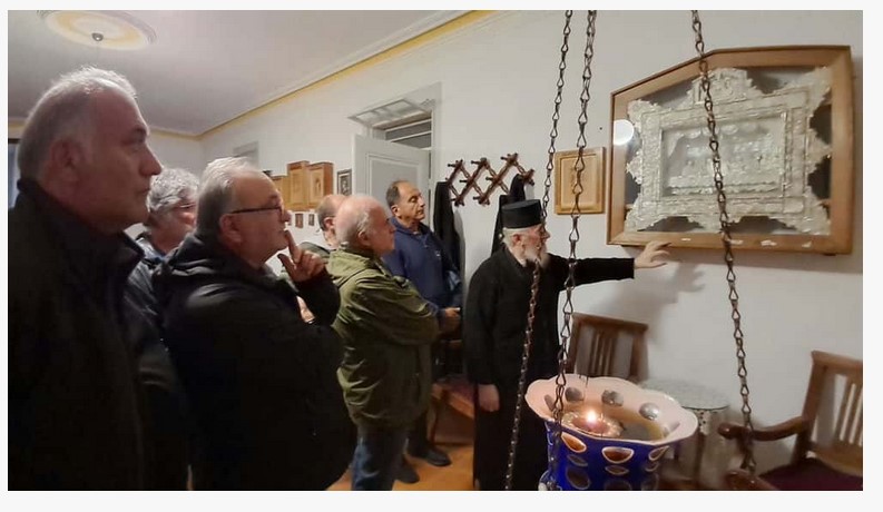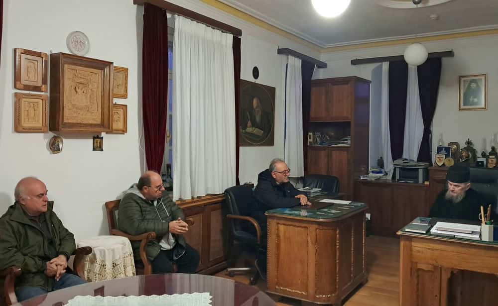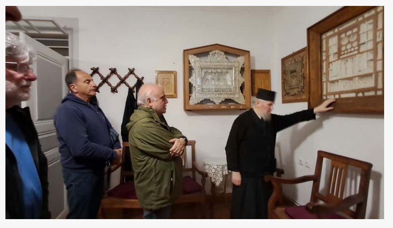 Η συνάντηση πραγματοποιήθηκε σε ιδιαίτερα θερμό κλίμα, με τον Ηγούμενο να δέχεται την αποστολή στο Γραφείο του, όπου και τους ξενάγησε σε μέρος της πλούσιας συλλογής των περίφημων ξυλόγλυπτων της Μονής. Τα ξυλόγλυπτα —ανεκτίμητα καλλιτεχνήματα που εντάσσονται στη γενικότερη συλλογή έργων τέχνης και κειμηλίων της Μονής— δεν βρίσκονται συγκεντρωμένα σε έναν χώρο, αλλά κοσμούν ποικίλα σημεία εσωτερικα΄του μοναστηριού, συμπεριλαμβανομένου και του Γραφείου του Ηγουμένου.