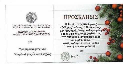 Ατζέντα ΕκδηλώσεωνΕιδήσειςΕκκλησία Πρόσκληση βασιλόπιτας Αγαθοεργού Αδελφότητας Κω «Άγιος Ιωάννης ο Ναύκληρος» στο Costa Palace Από aegeanews - 2 Ιαν 2026 0 44 Κοινοποίηση στο Facebook Μοιραστείτε στο X