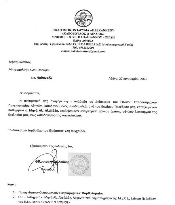 ΕιδήσειςΕκκλησίαΠολιτισμός - Τέχνες Πολιτιστικό Ίδρυμα «Κλεόβουλος ο Λίνδιος»: Συγχαρητήριο μήνυμα προς κ. Ναθαναήλ για την αναγόρευση του σε Διδάκτορα του ΕΚΠΑ Από aegeanews - 27 Ιαν 2026 0 32 Κοινοποίηση στο Facebook Μοιραστείτε στο X