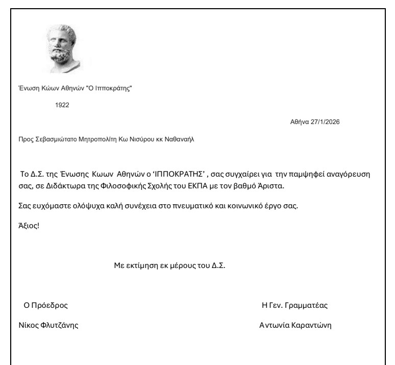Νίκος Στ. Μανούσης : Συγχαρητήριες Ευχές για την αναγόρευση σε Διδάκτορα του ΕΚΠΑ του Σεβασμιωτάτου Μητροπολίτου Κωου κ Νισύρου κ. κ.Ναθαναήλ