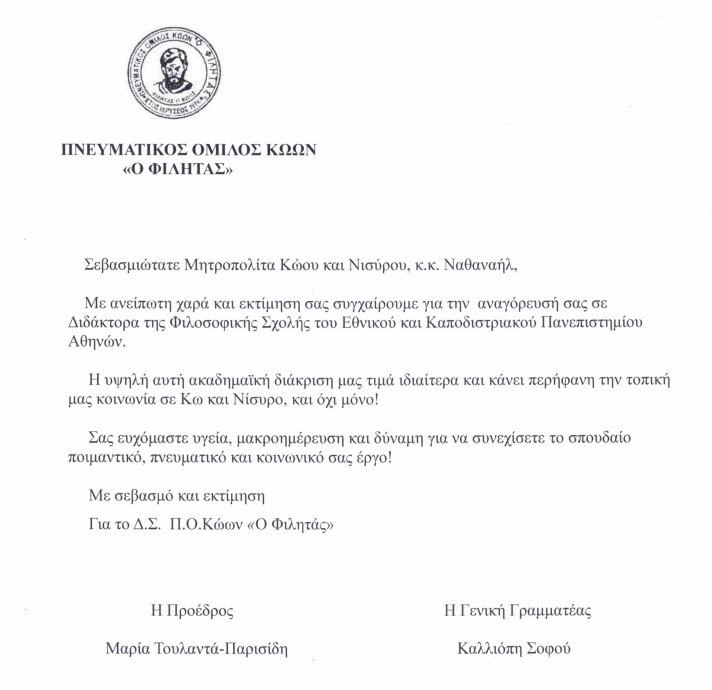 Συγχαρητήριες επιστολές προς τον Σεβασμιώτατο Μητροπολίτη Κώου και Νισύρου κ. Ναθαναήλ