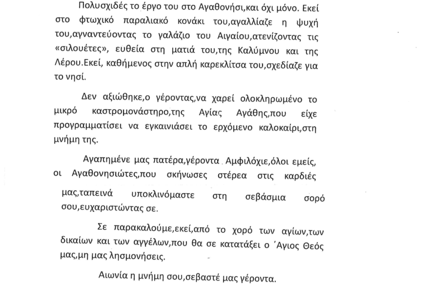 Ο Θεός να αναπαύσει το γέροντα μας! Τον πατέρα μας, που τα τελευταία 2,5 χρόνια ζούσε εδώ στο Αγαθονήσι και μας έμαθε την ουσία της ζωής! Τόσο ο ίδιος όσο και η αγαπητή αδελφή Γαβριηλία, με την αφοσίωση της σε εκείνον και στο έργο του εδώ και πάρα πολλά χρόνια.