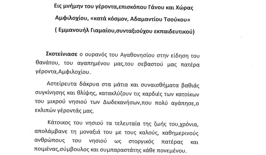 «Με οδύνη πληροφορήθηκα την εκδημία του μακαριστού Μητροπολίτου πρώην Γάνου και Χώρας, κυρού Αμφιλοχίου, του φιλεύσπλαχνου Ιεράρχη του Οικουμενικού Θρόνου και άξιου τέκνου της Δωδεκανήσου..