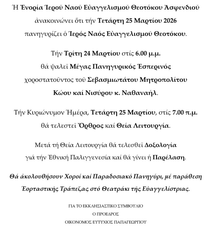 Με μεγάλη χαρά σας προσκαλούμε στο παραδοσιακό πανηγύρι που θα πραγματοποιηθεί την 25η Μαρτίου, αμέσως μετά το πέρας της παρέλασης, στο θεατράκι της Ευαγγελίστριας.