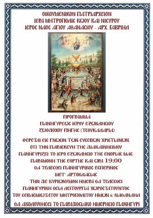Πρόγραμμα πανηγύρεως Ιερού Εξωκκλησίου Παναγίας Τσουκαλαριάς (Ζωοδόχου Πηγής)
