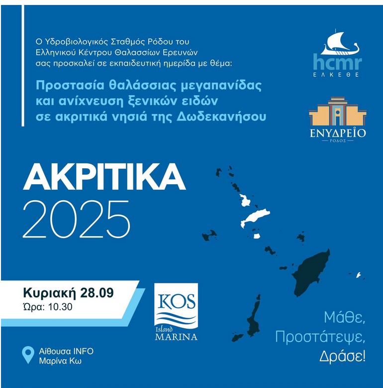Ο Υδροβιολογικός Σταθμός Ρόδου του Ελληνικού Κέντρου Θαλασσίων Ερευνών, διοργανώνει εκπαιδευτικές ημερίδες στο πλαίσιο του προγράμματος «Φυσικό Περιβάλλον και Κλιματική Ανθεκτικότητα 2025 – Εξωστρεφείς δράσεις 2025», το οποίο χρηματοδοτείται από το Πράσινο Ταμείο, με τίτλο «Προστασία θαλάσσιας μεγαπανίδας και ανίχνευση ξενικών ειδών σε ακριτικά νησιά της Δωδεκανήσου»