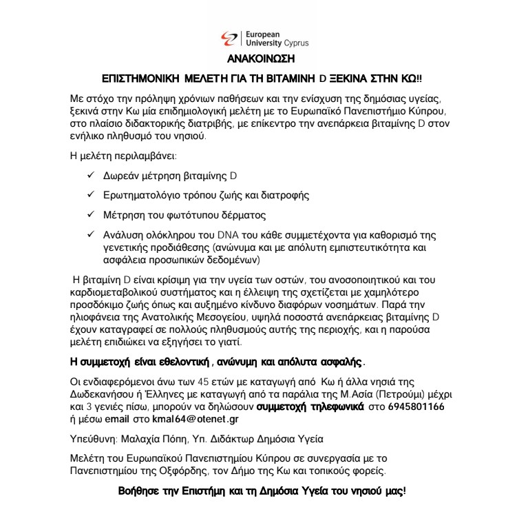 Επιστημονική μελέτη για τη βιταμίνη D ξεκινά στην Κω | Υπεύθυνη: Μαλαχία Πόπη