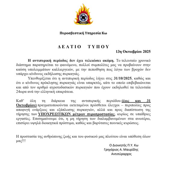 Εν Δωδεκανήσω Πυροσβεστική Υπηρεσία Κω: Η αντιπυρική περίοδος δεν έχει τελειώσει ακόμη