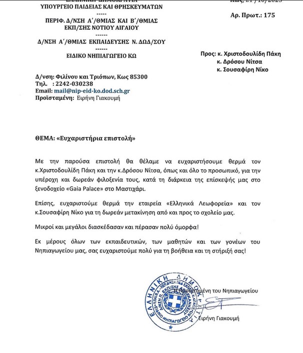 ΕιδήσειςΕν Δωδεκανήσω Ειδικό Νηπιαγωγείο Κω: Ευχαριστήρια επιστολή Από aegeanews - 23 Οκτ 2025 0 12 Κοινοποίηση στο Facebook Μοιραστείτε στο X