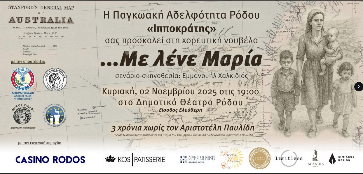Η Παγκωακή Αδελφότητα Ρόδου «Ιπποκράτης» παρουσιάζει τη χορευτική νουβέλα, με τίτλο «Με λένε Μαρία», σε σενάριο και σκηνοθεσία Εμμανουήλ Χαλκιδιού, την Κυριακή 2 Νοεμβρίου 2025 και ώρα 19:00, στο Δημοτικό Θέατρο Ρόδου.
