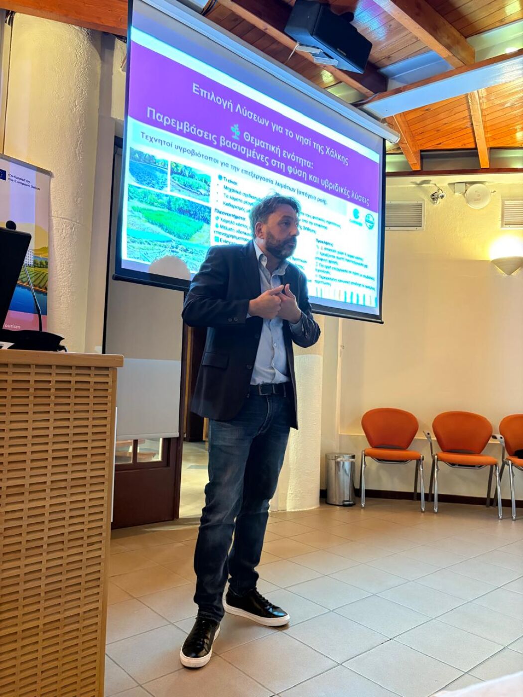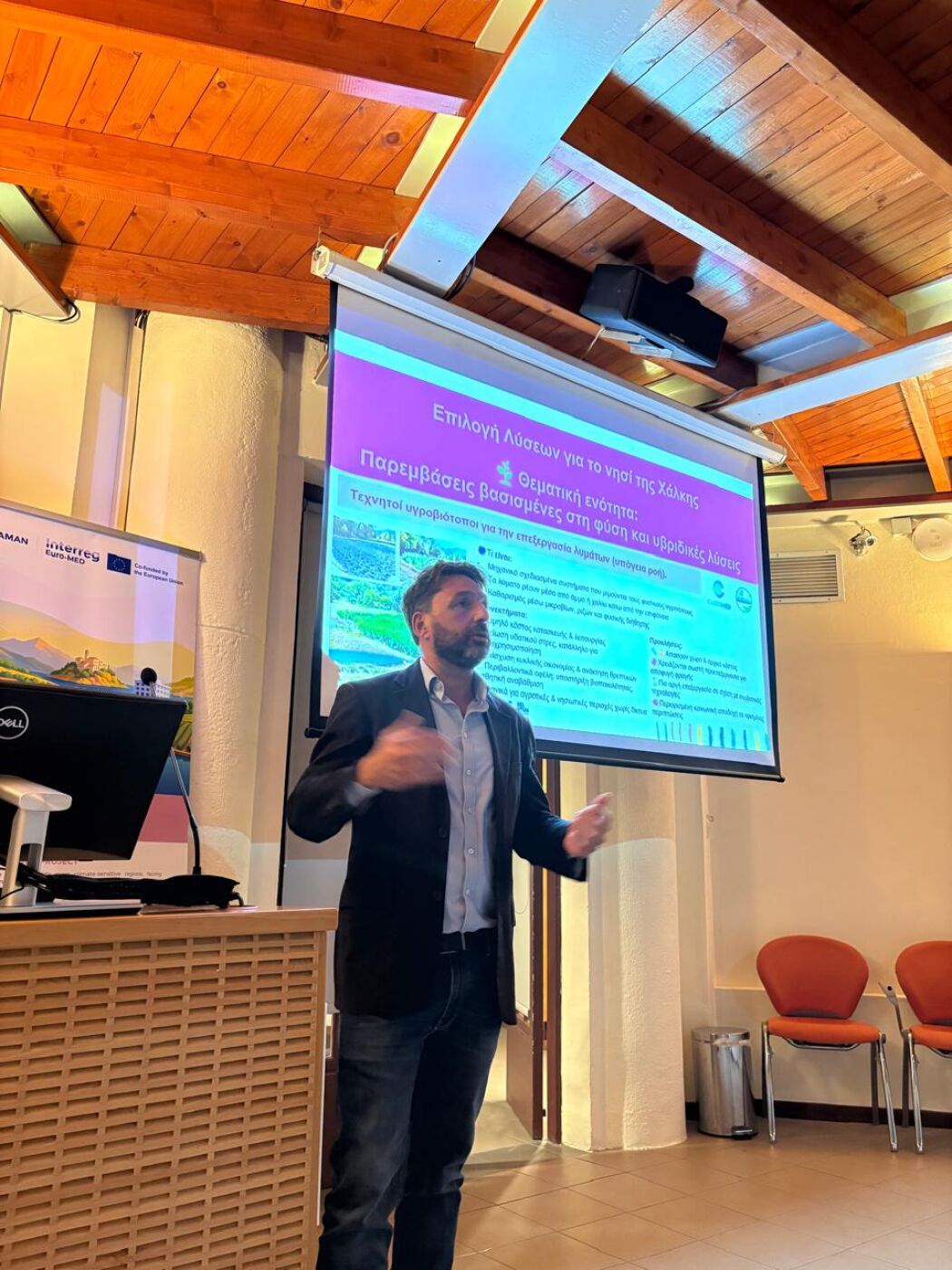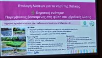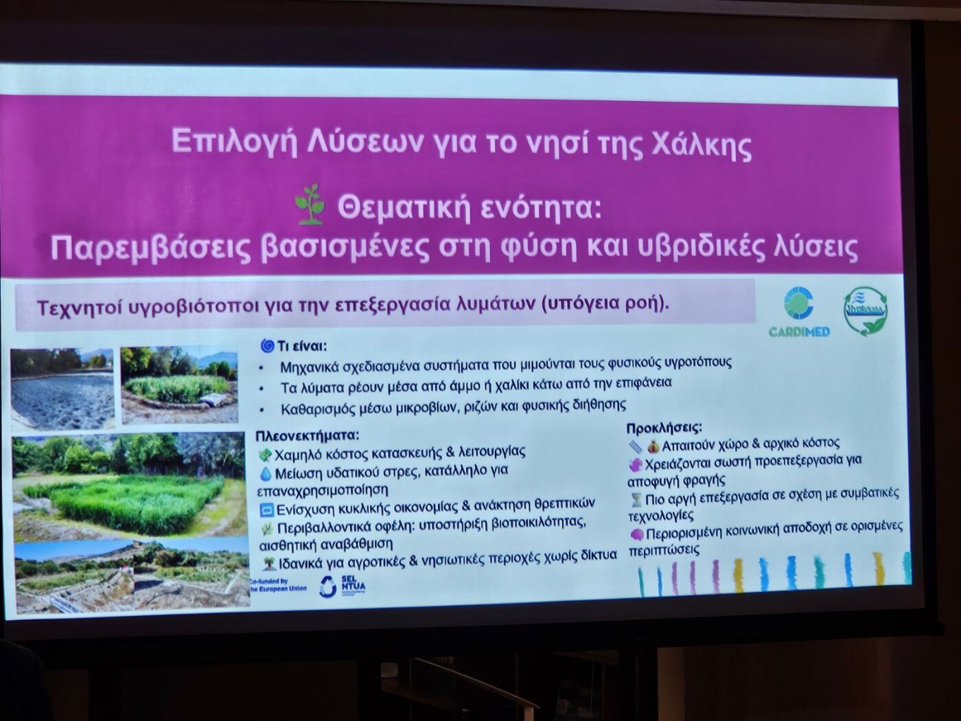 Στο πλαίσιο του Εργαστηρίου, παρουσιάστηκαν ενδεικτικές λύσεις όπως τεχνητοί υγροβιότοποι, πράσινες υποδομές, συστήματα επαναχρησιμοποίησης νερού και εργαλεία καινοτόμου υδατικής διαχείρισης, με ειδικές αναφορές στην εφαρμόσιμη προοπτική για τη Χάλκη και τη Δωδεκάνησο.