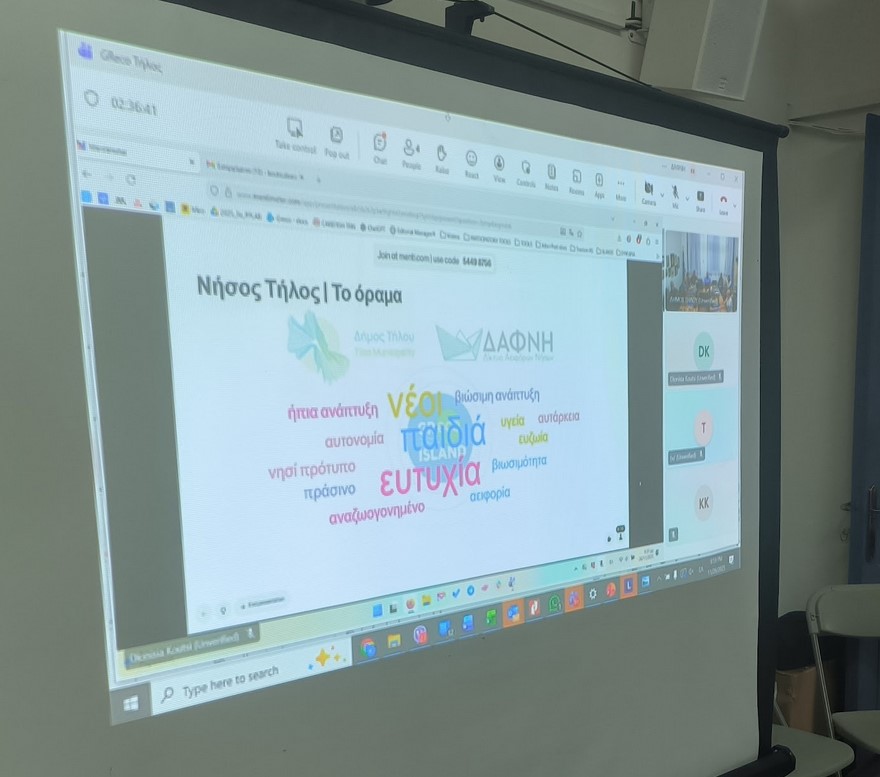 Ακολούθησε παρουσίαση της μεθοδολογίας και του πλαισίου συμμετοχικού σχεδιασμού από την Δρ. Διονυσία Κούτση, καθώς και συνοπτική αποτύπωση της υφιστάμενης κατάστασης της Τήλου από την ομάδα έργου του ΔΑΦΝΗ.