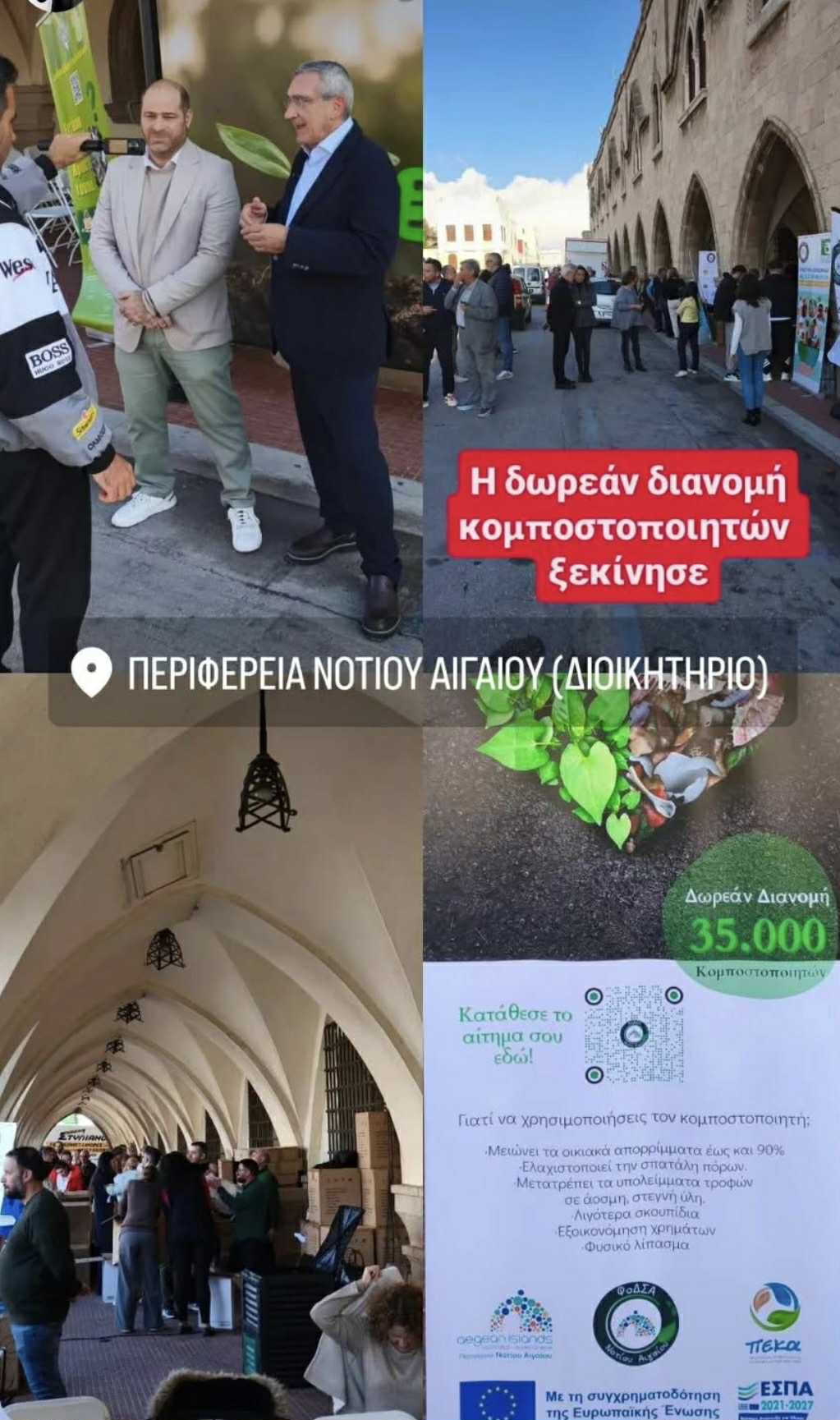 Το ενδιαφέρον και η συμμετοχή του κόσμου στο πρόγραμμα της Οικιακής Κομποστοποίησης είναι παραπάνω απο ελπιδοφόρο. Σήμερα, απο το πρωί στην πλατεία Δημαρχείου της Ρόδου, ξεκίνησε η διανομή Οικιακών Κομποστοποιητών και εκεί βρίσκονται άνθρωποι του ΦοΔΣΑ Ν. Αιγαίου, του Δήμου Ρόδου και της Περιφέρειας Ν. Αιγαίου για να εξυπηρετήσουν όσους επιθυμούν να συμμετάσχουν στην δράση.Η διανομή ξεκίνησε απο την Ρόδο και μέσα στον Δεκέμβριο προγραμματίζονται και τα υπόλοιπα νησιά μας, προκειμένου να μας βρεί όλους το 2026 σε πιο green διάθεση!