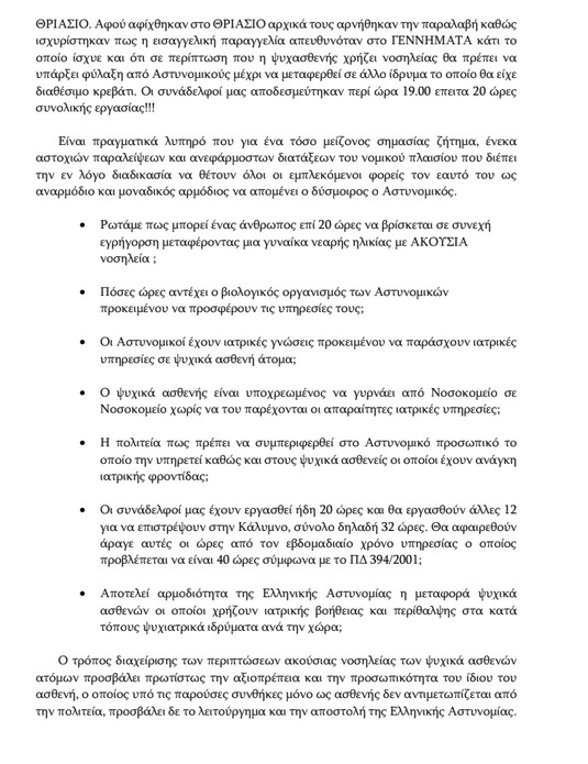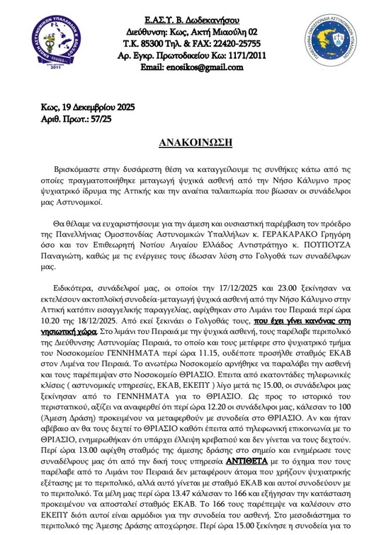 Εν Δωδεκανήσω Ένωση Αστυνομικών Β. Δωδεκανήσου: Καταγγελία για τις συνθήκες μεταγωγής ψυχικά ασθενούς σε...