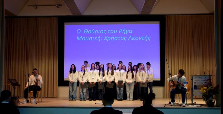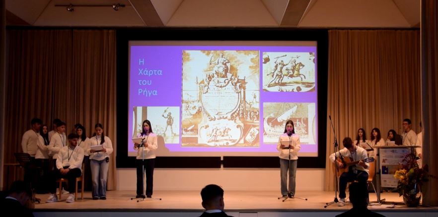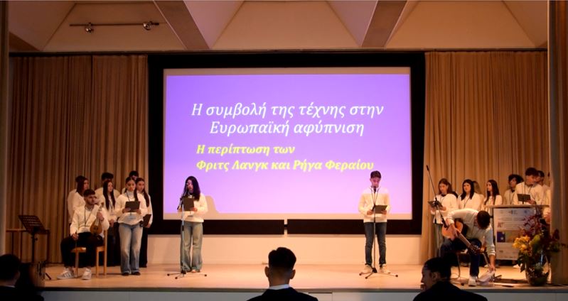 Το σχολείο μας εκπροσωπήθηκε από ομάδα 23 μαθητών και μαθητριών, η οποία παρουσίασε την εισήγησή μας με τίτλο: «Η συμβολή της τέχνης στην Ευρωπαϊκή αφύπνιση. Η περίπτωση των Φριτς Λανγκ και Ρήγα Φεραίου».