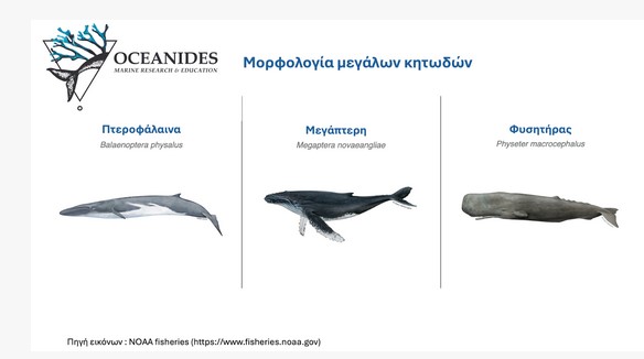 Στην παρακάτω εικόνα βλέπουμε κάποια από τα διαφορετικά είδη μεγάλων κητωδών που μπορεί να συναντήσουμε στα ελληνικά νερά. Η πτεροφάλαινα και ο φυσητήρας διατηρούν μόνιμους πληθυσμούς, ενώ η μεγάπτερη βρίσκεται σπάνια στην περιοχή μας.
