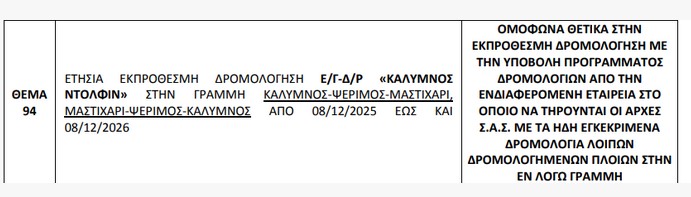 Σύμφωνα με την απόφαση, το πλοίο επιστρέφει στη γραμμή Κάλυμνος – Ψέριμος – Μαστιχάρι και επιστροφή, ενισχύοντας την ακτοπλοϊκή σύνδεση Καλύμνου και Κω και με επιπλέον προσεγγίσεις στην Ψέριμο και αυξάνοντας το συνολικό αριθμό των ημερήσιων δρομολογίων σε συνδυασμό με τα ήδη υφιστάμενα δρομολόγια των άλλων σκαφών και εξυπηρετώντας το επιβατικό κοινό , κατοίκους και επισκέπτες.