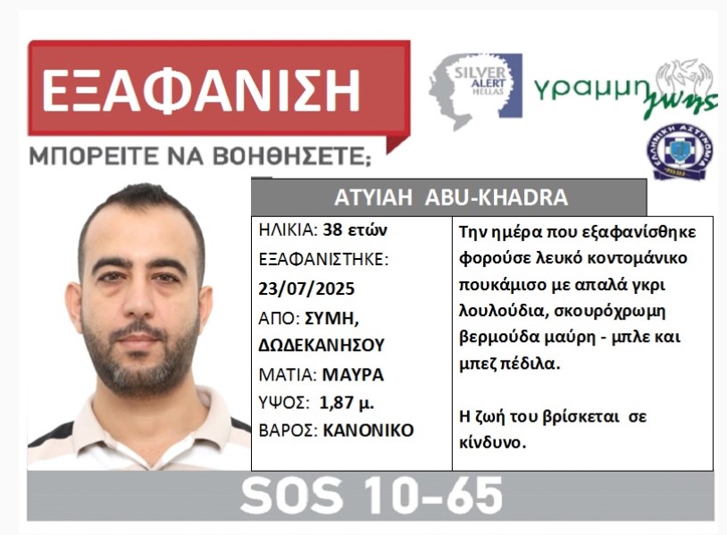 Η εξαφάνιση ενός ανθρώπου δεν είναι ποτέ μια απλή είδηση ρουτίνας. Είναι ένα γεγονός που μετατρέπει τον χρόνο σε βάρος και την καθημερινότητα σε συνεχή αναμονή. Στη Σύμη, από τις 23/07/2025, η υπόθεση του Atiyah Abu Khadra, 38 ετών, παραμένει ανοιχτή, με την οικογένεια να υποστηρίζει ότι από την πρώτη στιγμή υπήρχαν σημάδια κινδύνου, υπήρξαν κλήσεις για βοήθεια, υπήρξε στίγμα τοποθεσίας, υπήρξαν ενημερώσεις, όμως τελικά δεν υπήρξε αποτέλεσμα.