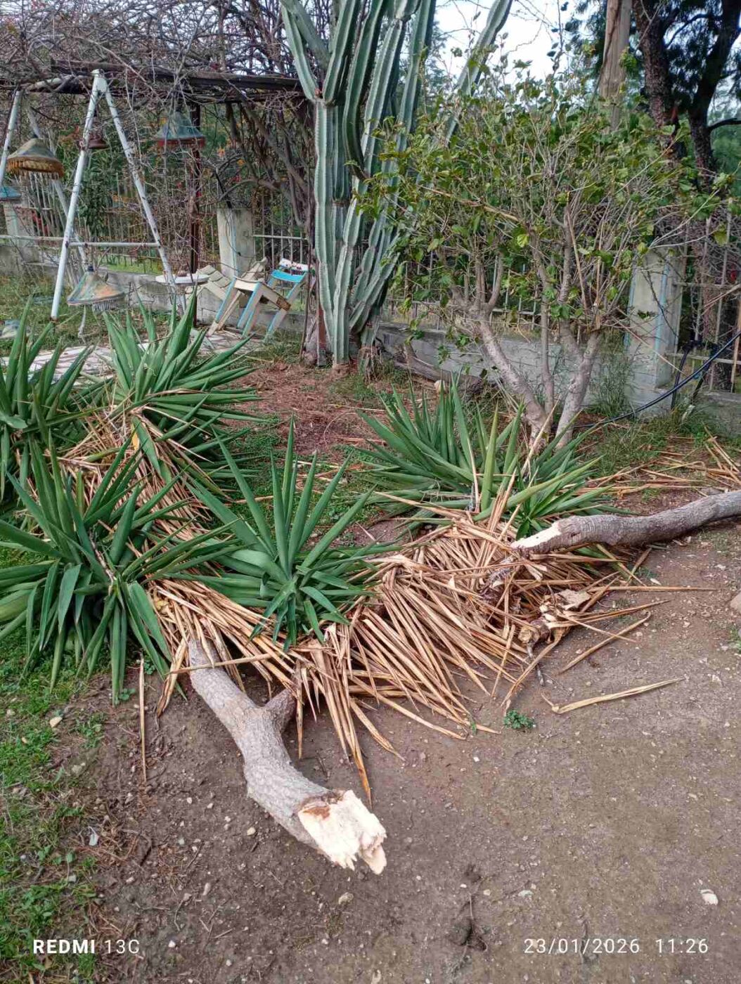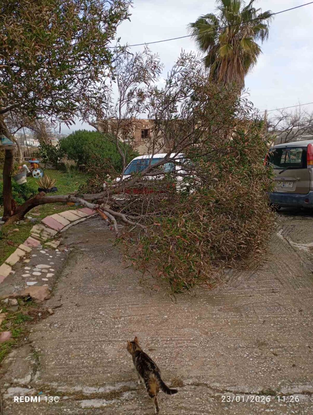 Ευτυχώς, όπως τονίζει ο κ. Βοναπάρτης, κανένα κομμάτι δεν κατέληξε στον δρόμο όπου διέρχονται οχήματα, αποτρέποντας τα χειρότερα.