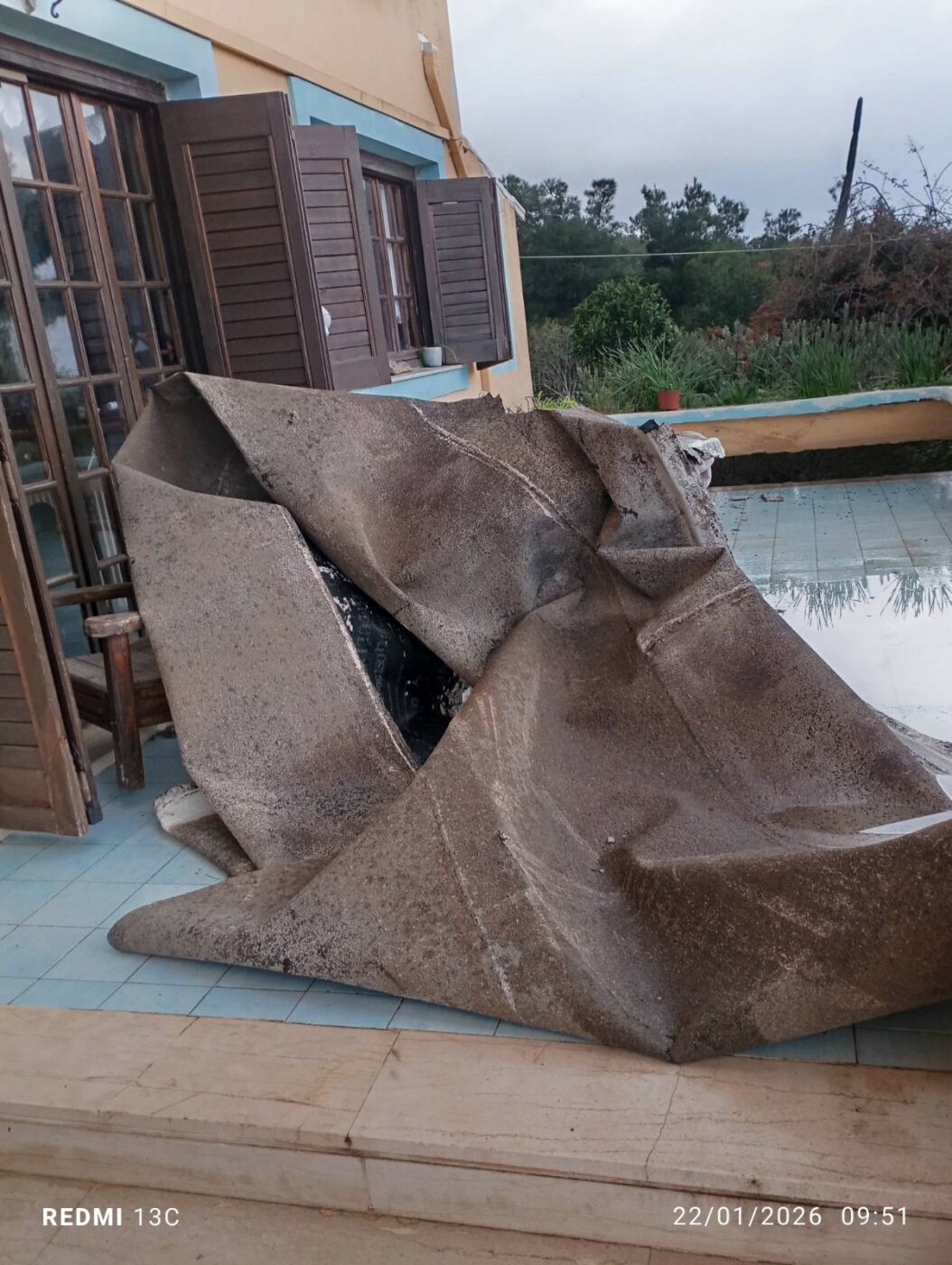 Τα υλικά παρασύρθηκαν από τον αέρα και διασκορπίστηκαν γύρω από το σπίτι, καταλαμβάνοντας ακόμη και τη βεράντα.