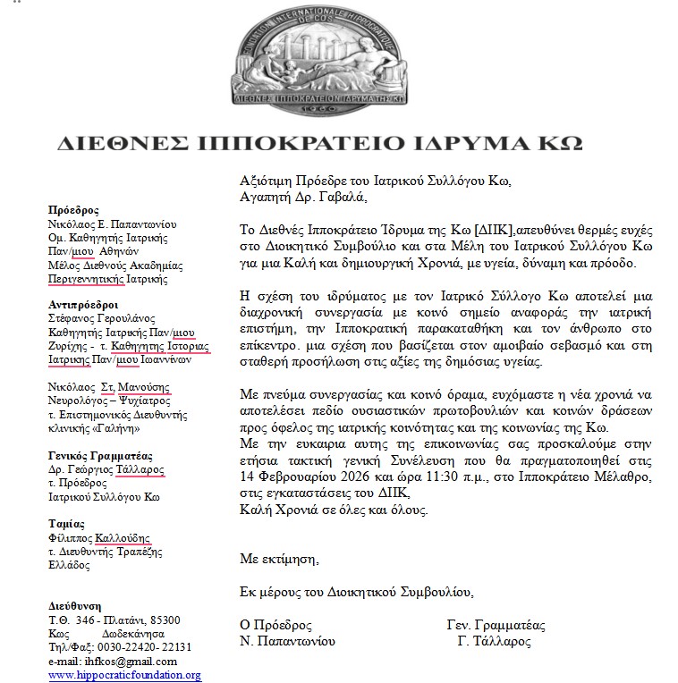 Εν Δωδεκανήσω Επιστολή από το Διεθνές Ιπποκράτειο Ίδρυμα Κω προς την Πρόεδρο και τα...