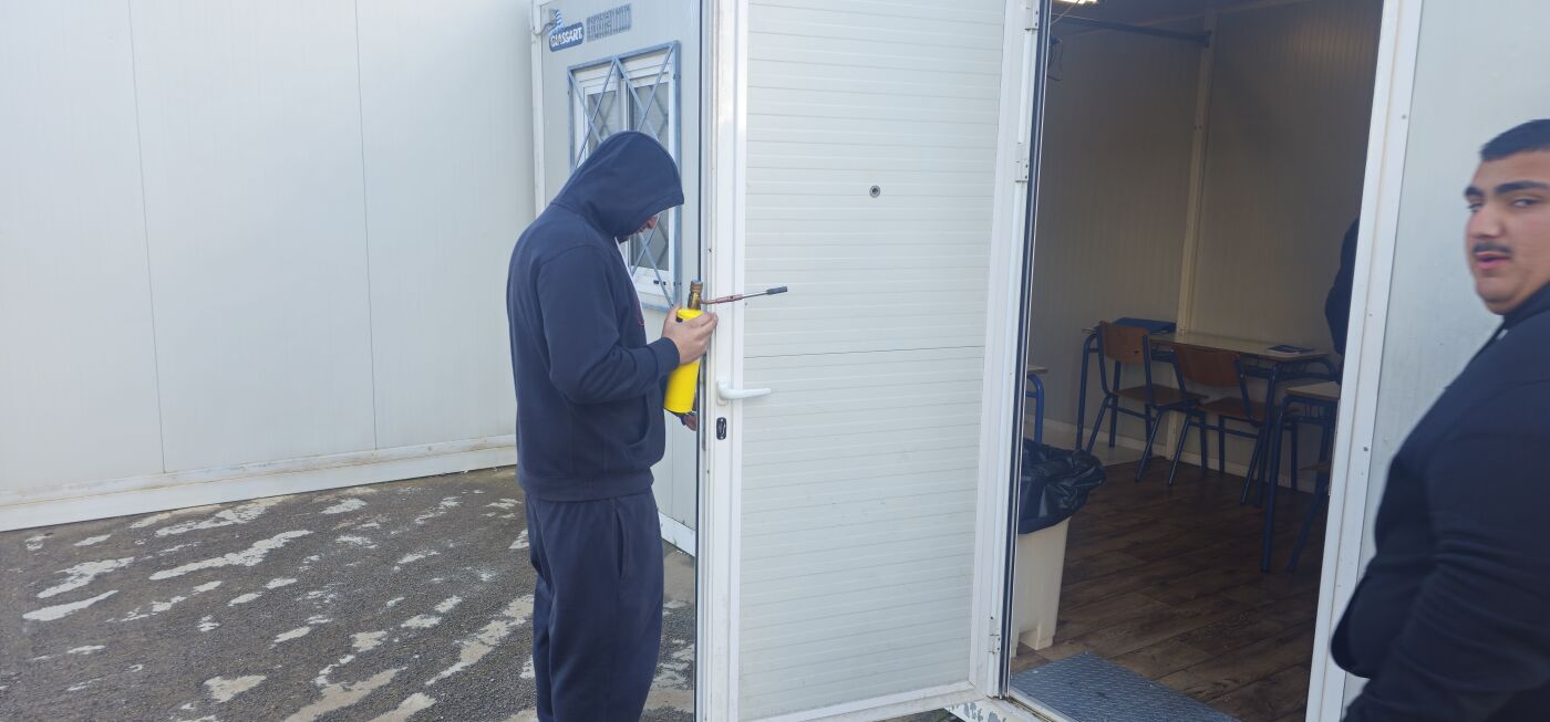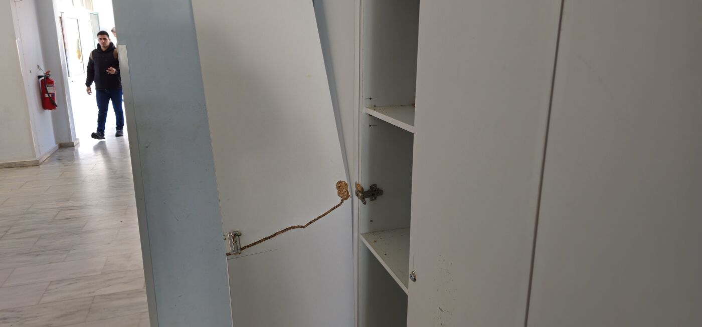 Όπως καταγγέλλεται, οι κλειδαριές στα κοντέινερ-αίθουσες παραβιάστηκαν και σε πολλές περιπτώσεις μπλοκαρίστηκαν με κόλλα και ξύλα, καθιστώντας αδύνατο το άνοιγμά τους.